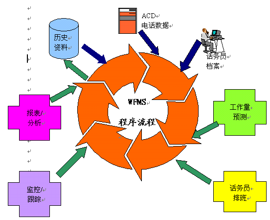 如上面所描述的WFMS流程,最初開始于歷史的電話信息、目前的ACD數(shù)據(jù)和服務代表的簡介。從這些綜合的信息,做出對工作量的預測,從而從本質(zhì)上決定了配備給呼叫中心的服務代表數(shù)量。了解了服務代表的需求數(shù)量,一個適用于任何時間段的工作時間表就可以產(chǎn)生了,包括每天的,每周的,每月的。基于這一點,主管人就可以監(jiān)控服務代表的行為,追蹤來電,并分析不同種類的來電分組,做出應對假定情景的方案,從而產(chǎn)生各種各樣的報告和圖表。